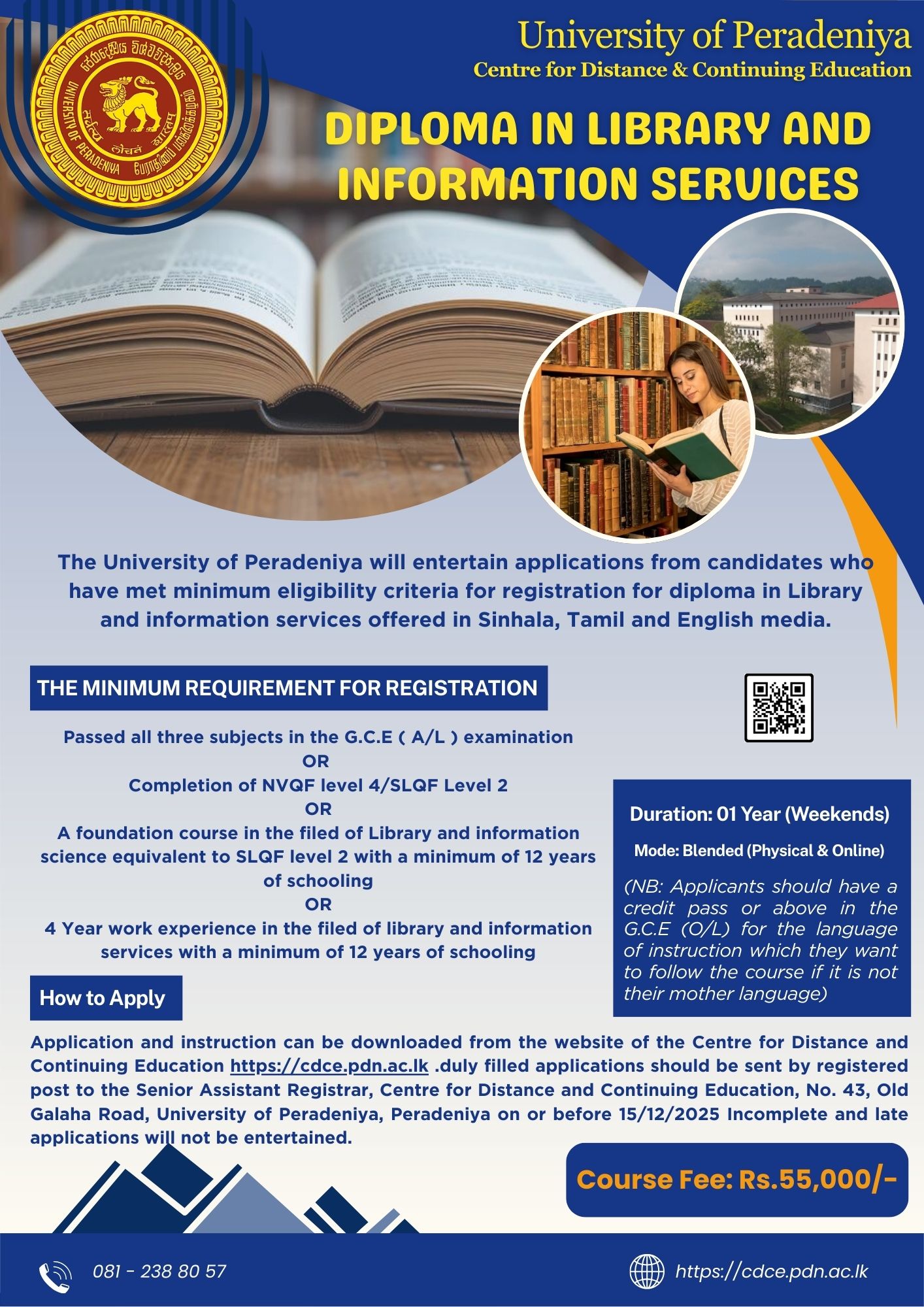 The University of Peradeniya will entertain applications from candidates who have met minimum eligibility criteria for registration for Diploma in Library and Information Services offered in Sinhala, Tamil and English media. Dully filled applications should be sent on or before 15.12.2025